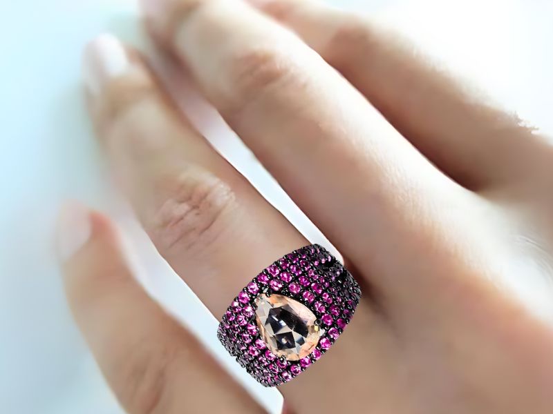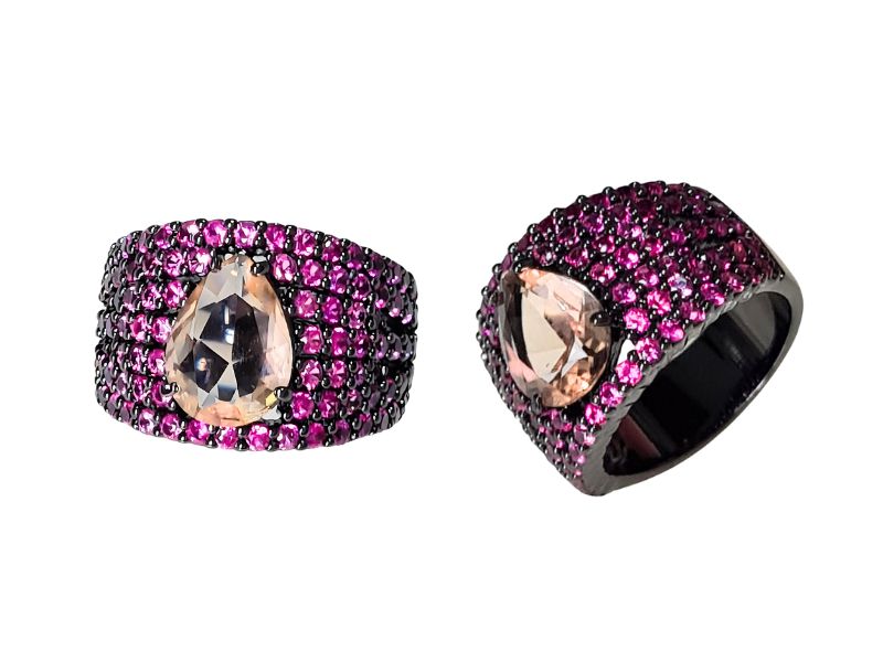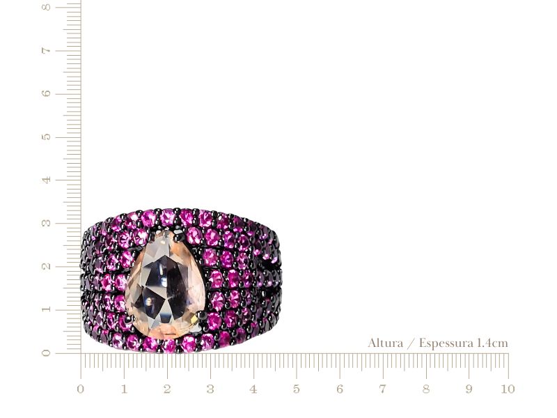 Cód. 005218/075 – Anel Gota Morganita Cravejado de Zircônias Rubi Pink em Banho de Ródio Negro