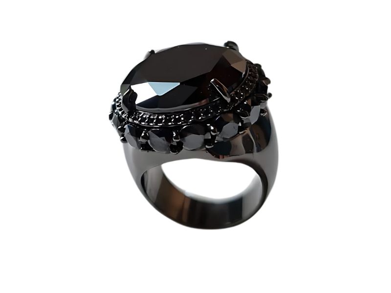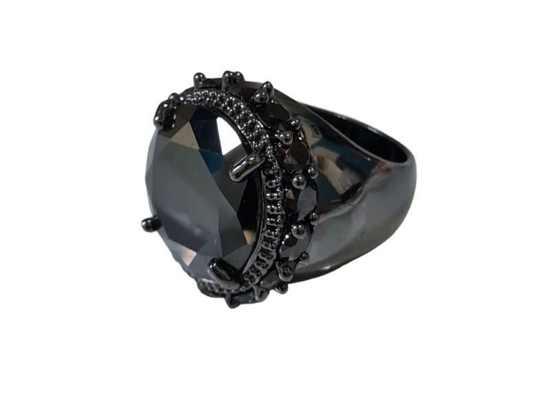 Cód. 005168/075 – Anel Redondo Multifacetado Ônix Cravejado de Zircônias Ovais Ônix em Banho de Ródio Negro