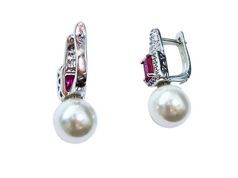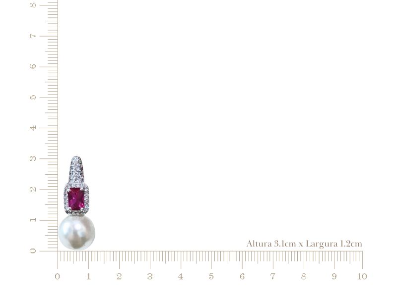Cód. 005271/030 – Brinco Argola Lapidação Carré Rubi Pink Cravejada de Zircônias Transparentes com Pérola de 12mm Branca em Banho de Prata 925