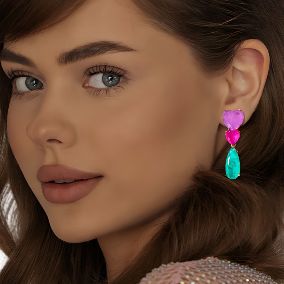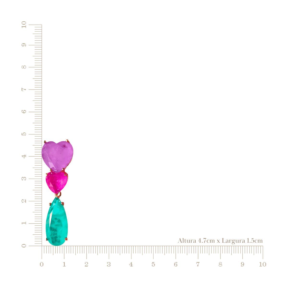 Brinco Corações Ametista, Turmalina Pink e Gota Turmalina Paraíba Fusion Premium em Banho de Ouro 18K