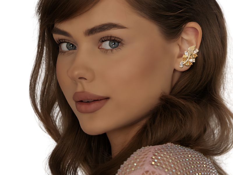 Cód. 005625/122 – Brinco Ear Cuff Gotas de Cristais Transparentes e Folhas Cravejadas de Zircônias Transparentes com Piercing em Banho de Ouro Amarelo
