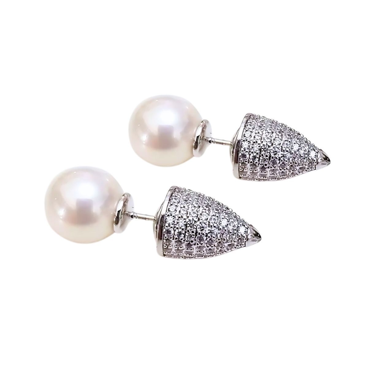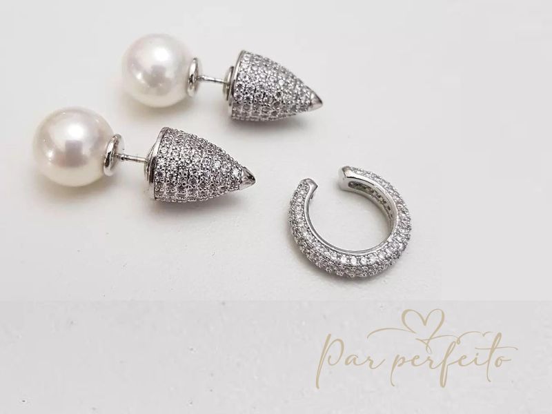 Cód. 005279/030 – Brinco Ear Jacket Pérola Branca 10mm e Cone Cravejado de Zircônias Transparentes em Banho de Ródio Branco