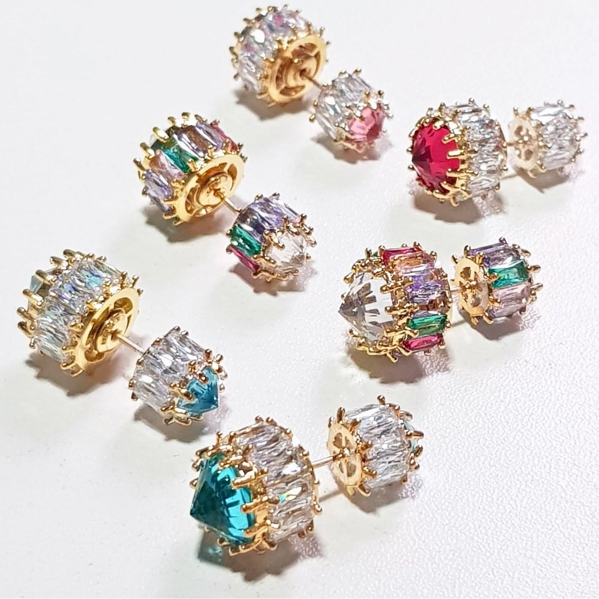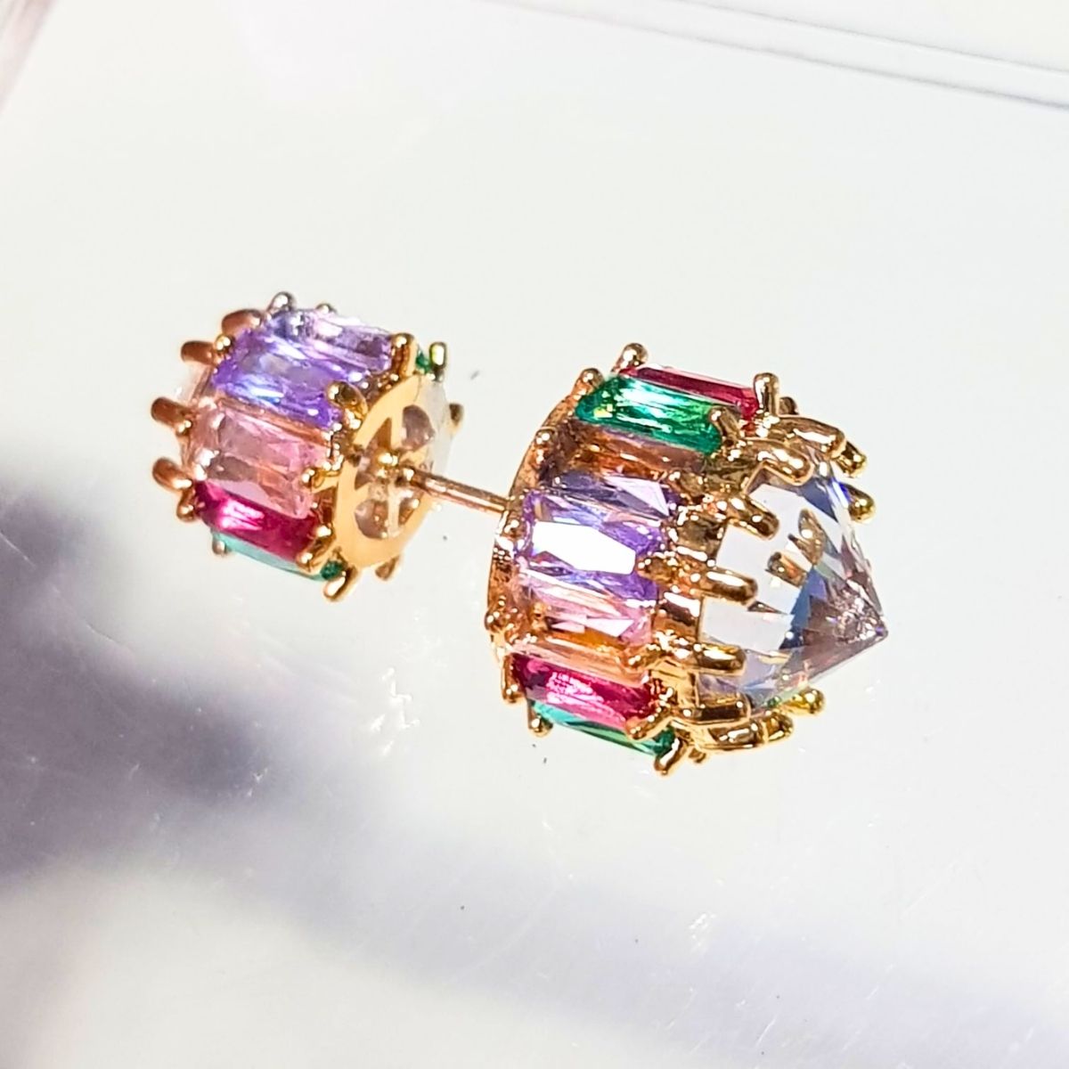 Cód. 005234/108 – Brinco Ear Jacket Zircônias Baguetes Coloridas e Cristal Cônico Multifacetado em Banho de Ouro 24K e 18K