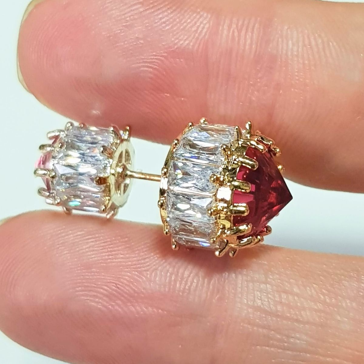 Cód. 005235/108 – Brinco Ear Jacket Zircônias Baguetes Transparentes e Cristal Cônico Multifacetado Safira Rosa e Rubi em Banho de Ouro 24K e 18K