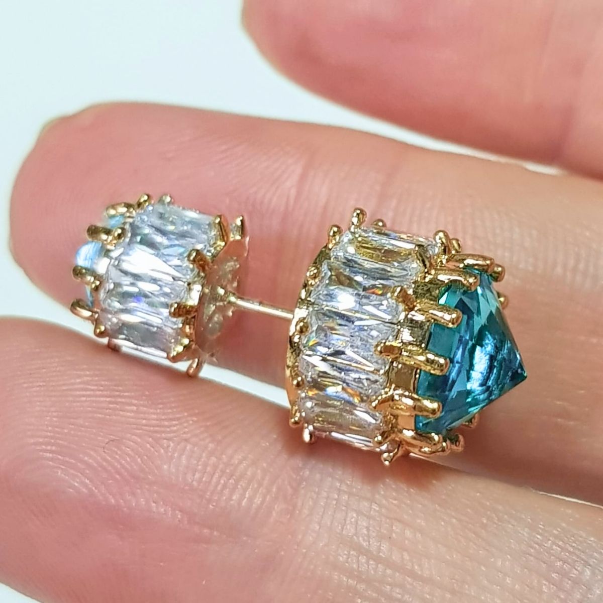 Cód. 005236/108 – Brinco Ear Jacket Zircônias Baguetes Transparentes e Cristal Cônico Multifacetado Água Marinha em Banho de Ouro 24K e 18K