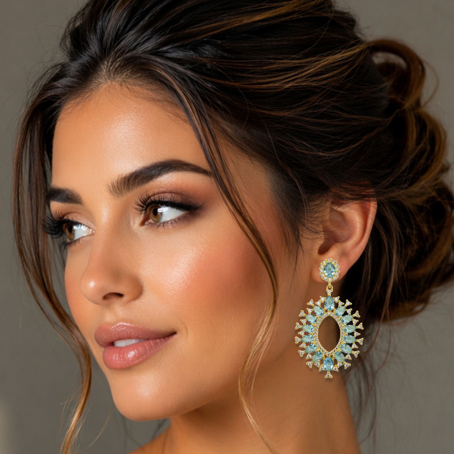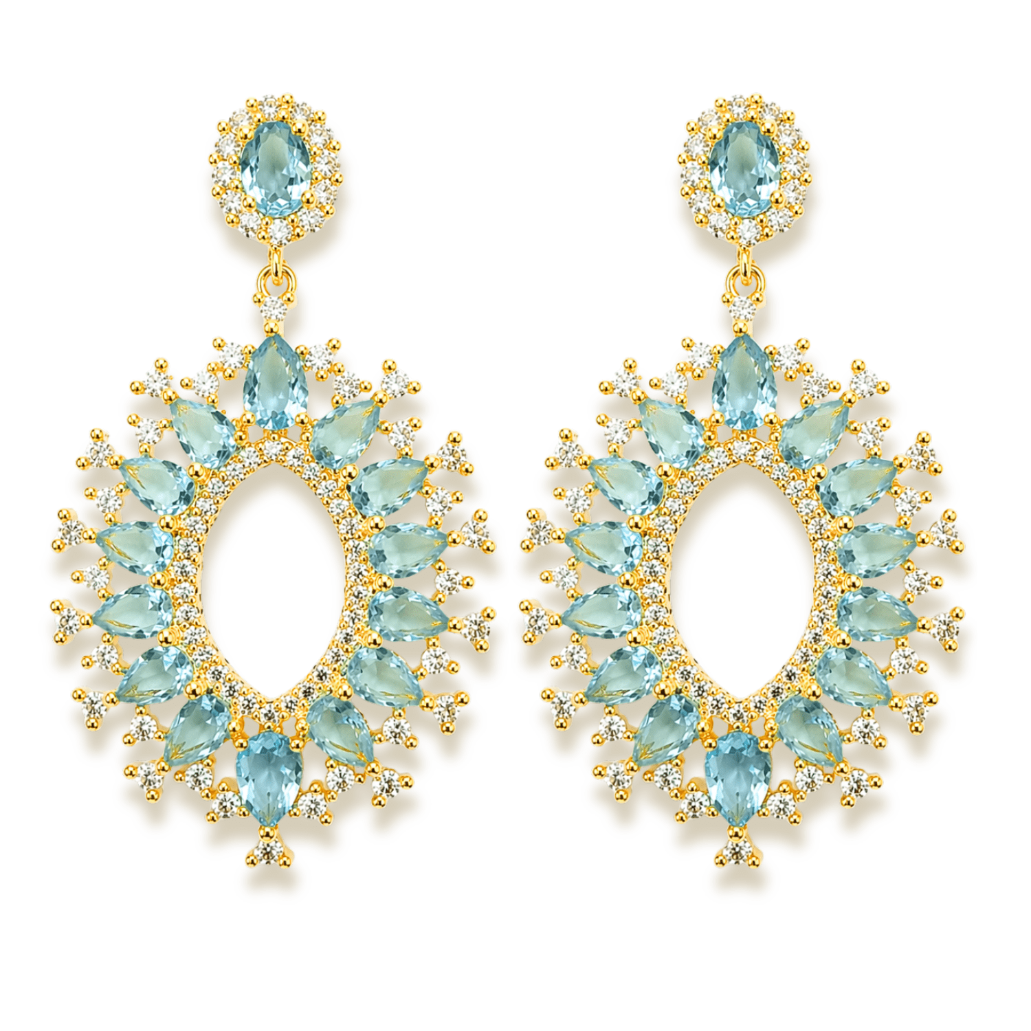 Brinco Longo Chandelier de Navetes em Água Marinha Cravejado Zircônias Cristal em Banho de Ouro 18k