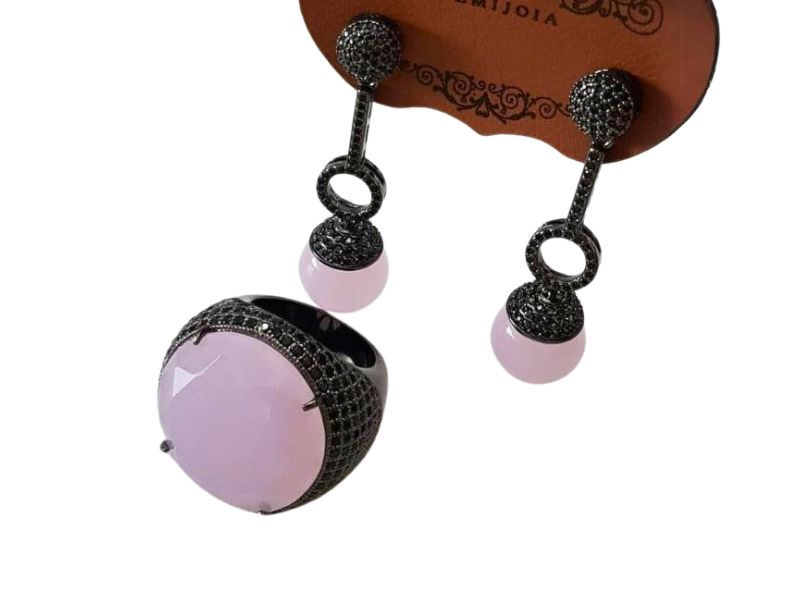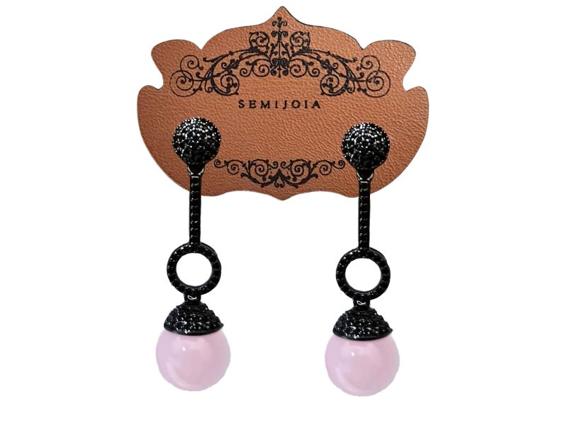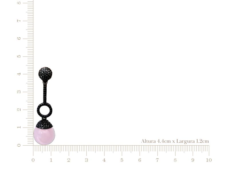 Cód. 005125/075 – Brinco Pêndulo Microcravejado Ônix e Bolas de Quarzto Rosa Leitoso em Banho de Ródio Negro