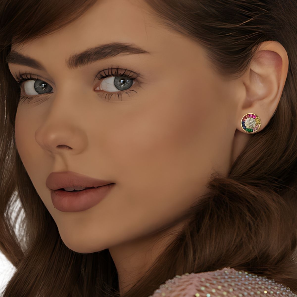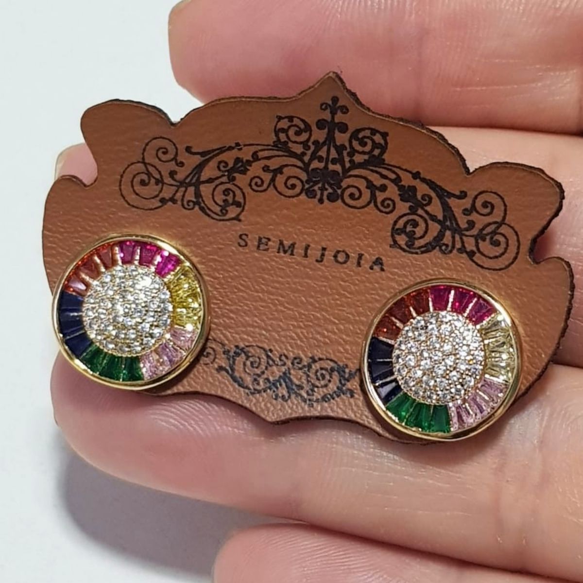 Cód. 005274/030 – Brinco Pizza de Baguetes Coloridas Cravejado de Zircônias Cristal em Banho de Ouro 18K