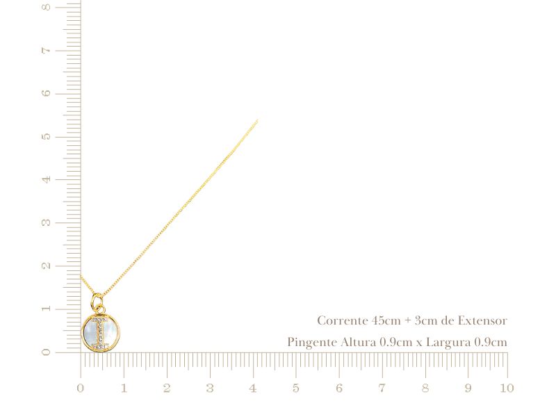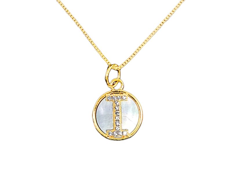 Cód. 004610/011 – Colar Letra “I” Corrente Veneziana e Pingente Redondo de Madrepérola Cravejado de Zircônias Transparentes em Banho de Ouro Amarelo
