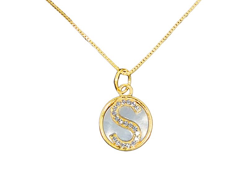 Cód. 004617/011 – Colar Letra “S” Corrente Veneziana e Pingente Redondo de Madrepérola Cravejado de Zircônias Transparentes em Banho de Ouro Amarelo