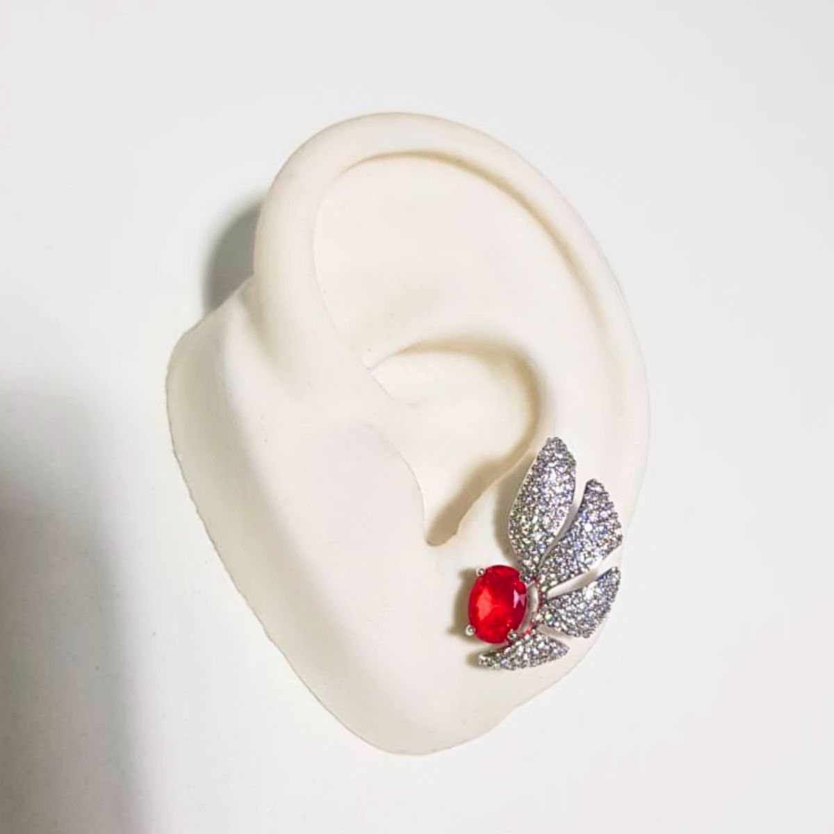 Cód. 005819/075 – Brinco EarCuff Cristal Oval Rubi Cravejado de Microzircônias Transparentes em Banho de Ródio Branco