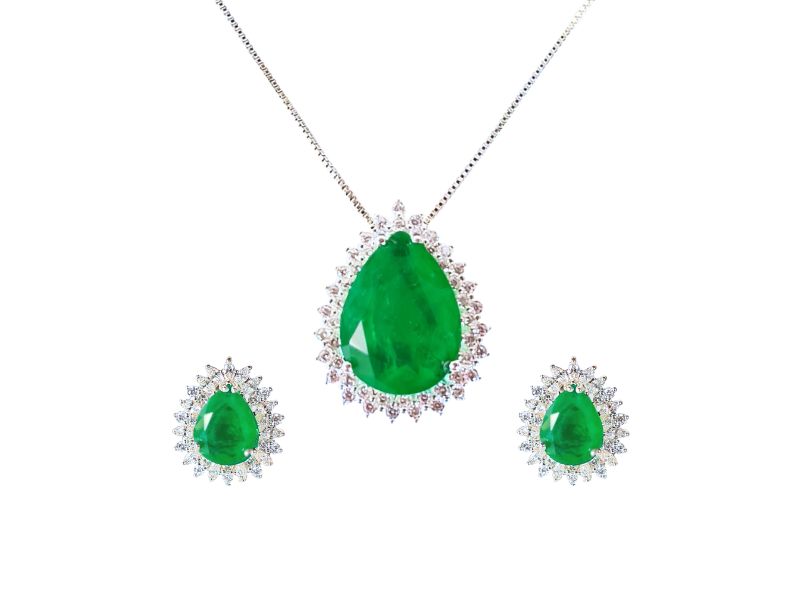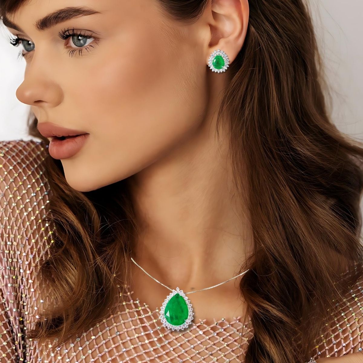Conjunto Colar e Brincos Gota Esmeralda Fusion Premium e Navetes de Zircônia Cristal em Banho de Prata 925