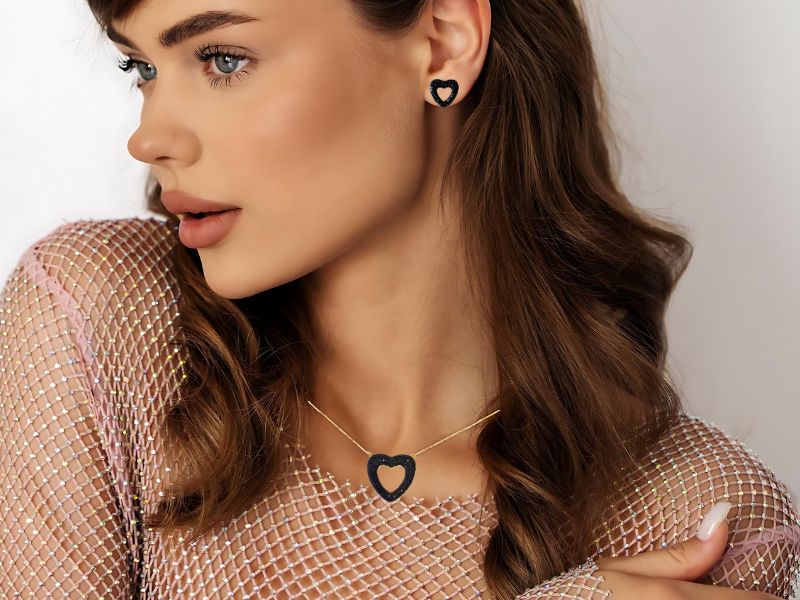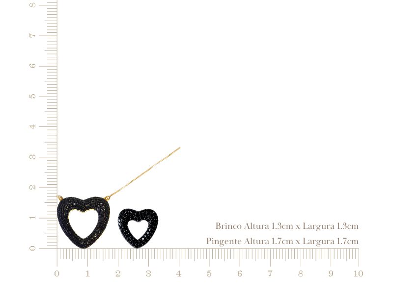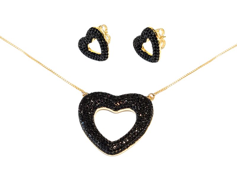 Cód. 005267/030 – Conjunto Coração Vazado Microcravejado de Zircônias Ônix em Banho de Ouro Amarelo Rodinado com Ródio Negro