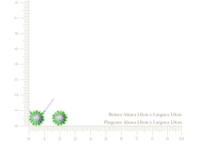 Cód. 005303/075 – Conjunto Flor Turmalina Verde Oliva Cravejado de Zircônias Transparentes com Pérola Branca em Banho de Prata 925