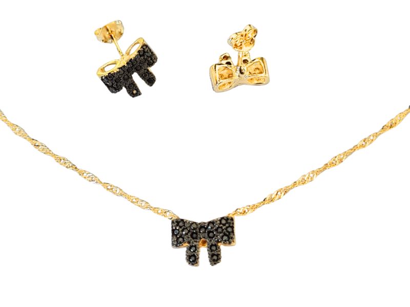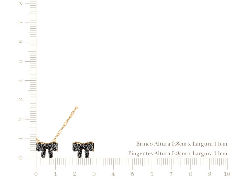 Cód. 004594/004 – Conjunto Laço Cravejado de Zircônias Ônix em Banho de Ouro Amarelo Rodinado com Ródio Negro