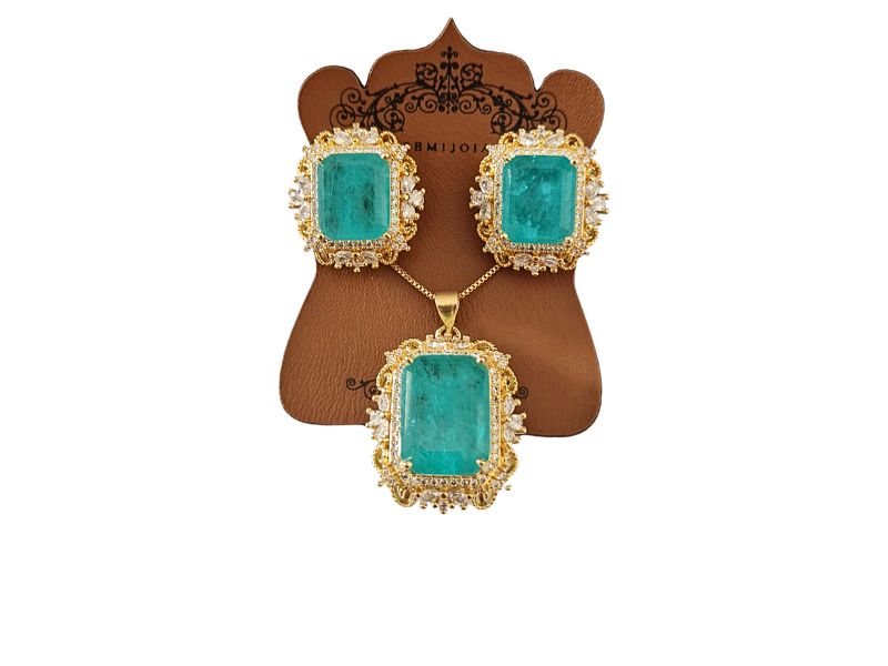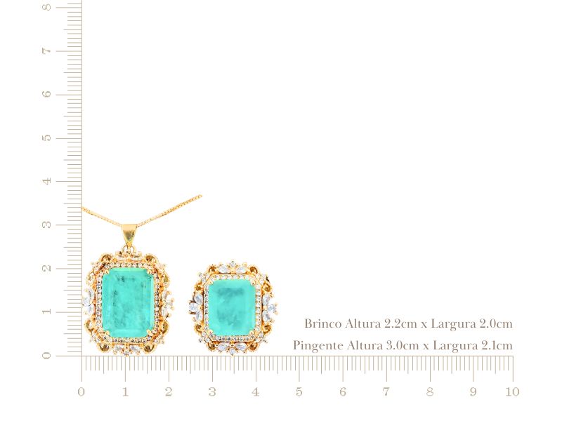 Cód. 005621-030 – Conjunto Retângulo Turmalina Azul Fusion Premium com Arabescos Cravejados de Zircônias Transparentes em Banho de Ouro Amarelo