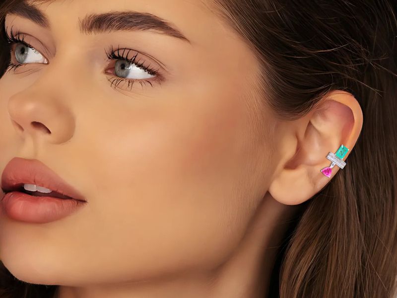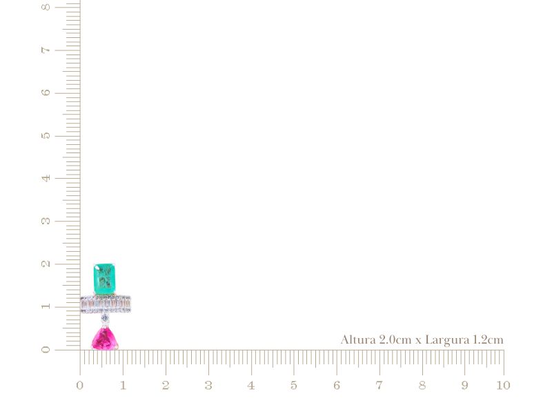 Ref. 003556/049 – Piercing Fake Unilateral Triângulo Turmalina Fúcsia e Retângulo Turmalina Paraíba Fusion Premium Cravejado de Baguetes e Zircônias Transparentes em Banho de Prata 925
