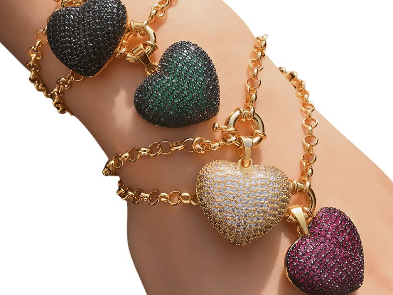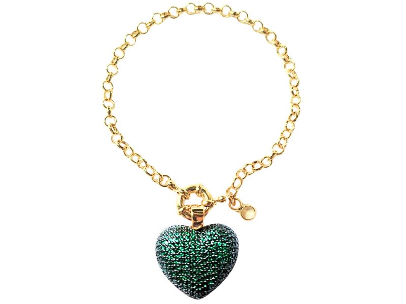 Cód. 005529/030 – Pulseira Elo Português com Fecho Bóia e Pingente de Coração Cravejado de Zircônias Esmeralda em Banho de Ouro Amarelo Rodinado com Ródio Negro